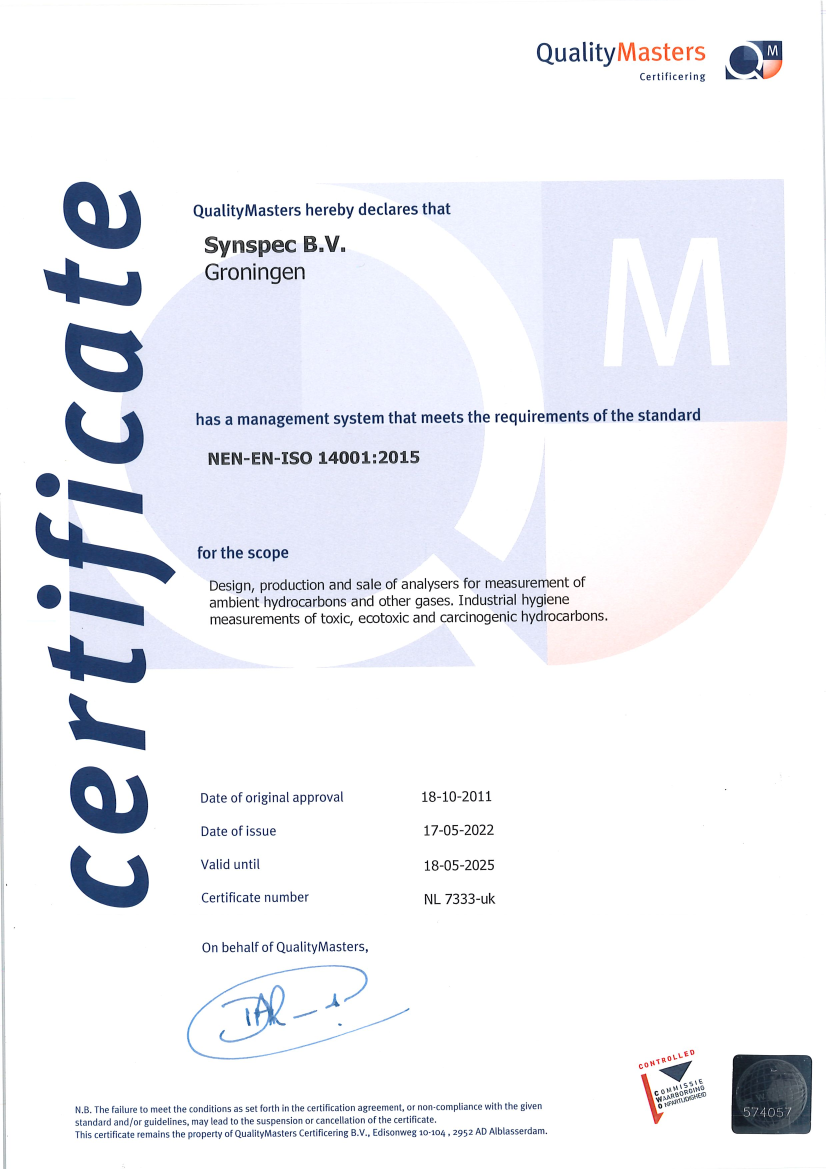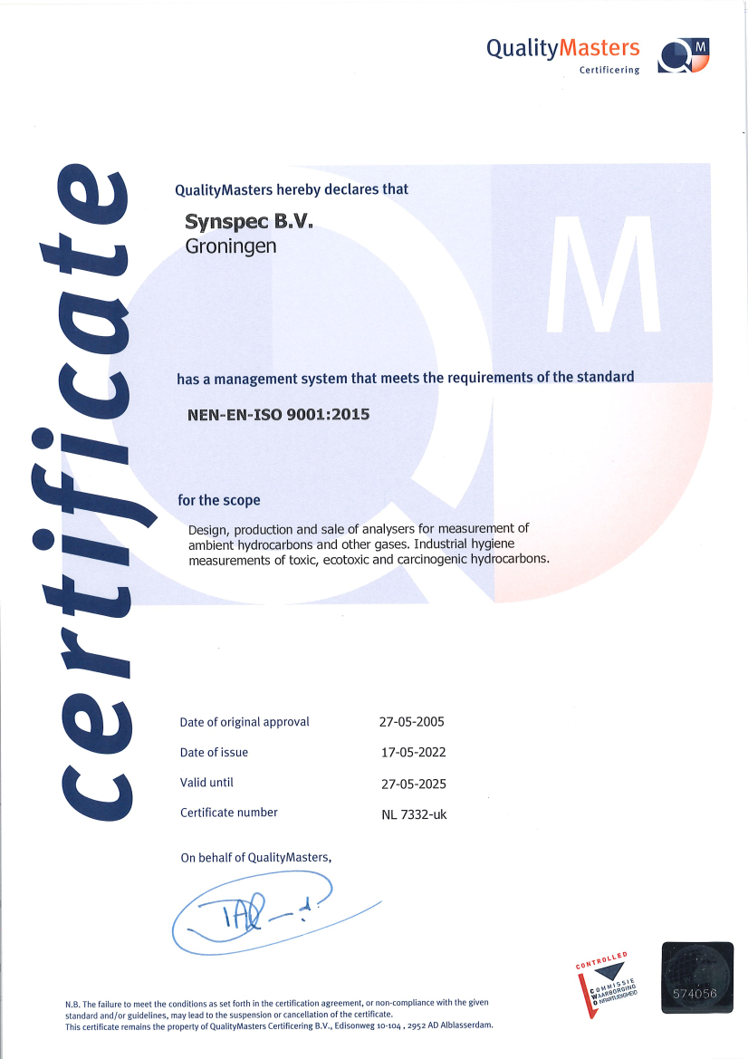 Synspec quality management system (QMS) complies to the ISO 9001:2015 standard. The ISO 9001 certificate has been granted to the company since 2005 and has been valuable in the process of continuous improvement of the organisation and its analytical equipment.